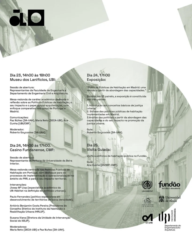 A sessão de abertura está marcada para as 14h00 de dia 23 de outubro, no Museu dos Lanifícios (UBI), e será seguida por uma mesa-redonda académica dedicada à comparação das políticas de habitação entre os dois países ibéricos. Este painel contará com comunicações de Paz Núñez (Universidade de Alcalá), Maria Neto (UBI) e Ana Cunha (Câmara Municipal do Fundão).