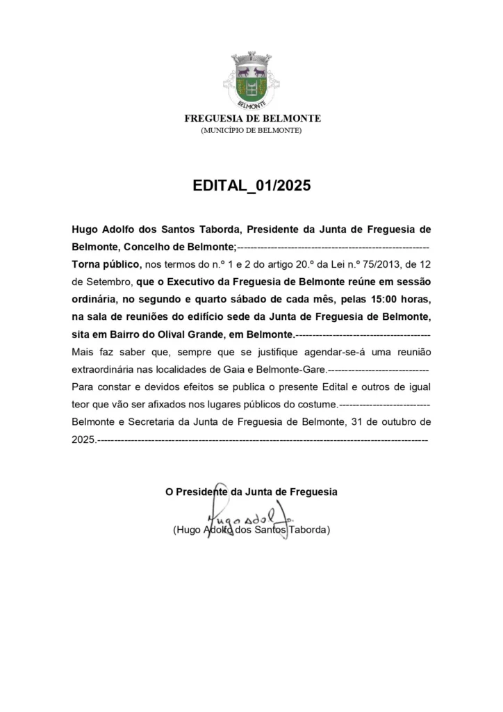O documento refere ainda que, sempre que se justifique, poderão ser agendadas reuniões extraordinárias nas localidades de Gaia e Belmonte-Gare.