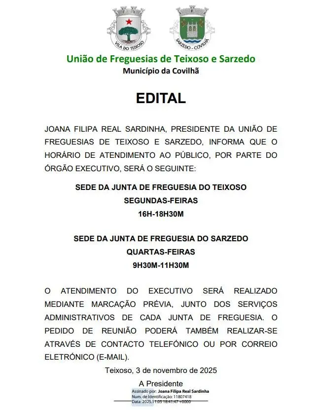A Presidente da União de Freguesias de Teixoso e Sarzedo, Joana Filipa Real Sardinha, informou, através de um edital datado de 3 de novembro, os novos horários de atendimento ao público por parte do órgão executivo.