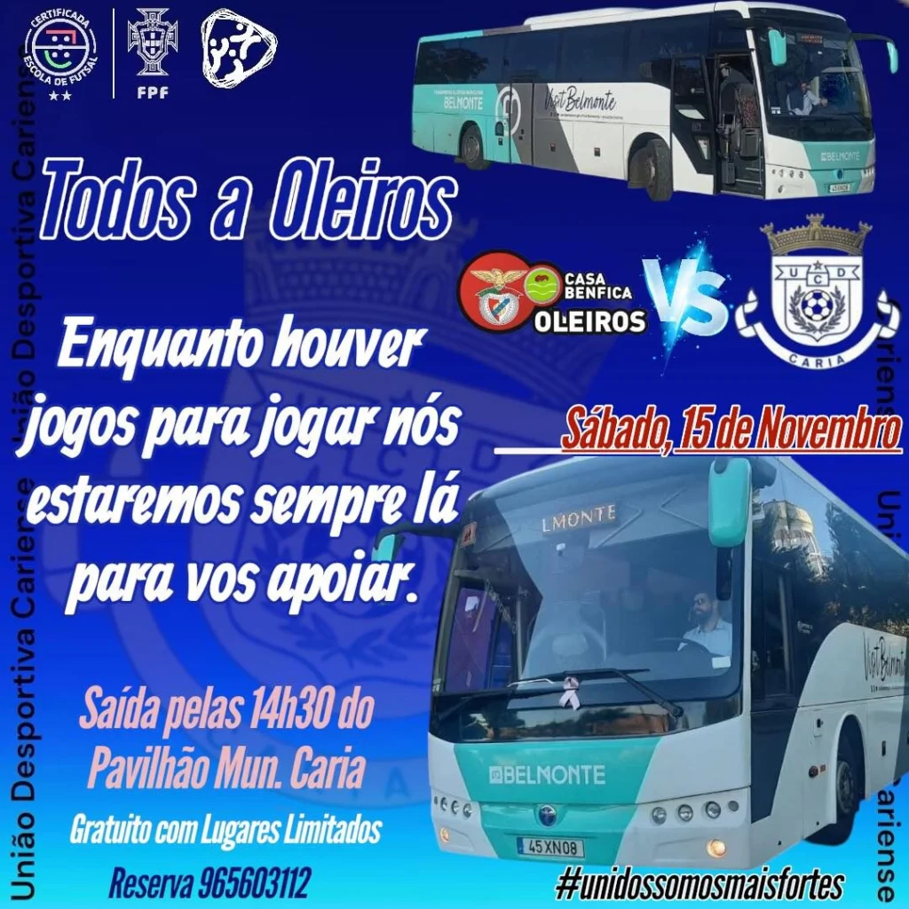 A União Desportiva Cariense está a organizar transporte para os adeptos apoiarem a equipa sénior no próximo desafio, que será disputado em Oleiros. O jogo contra a Casa Benfica Oleiros está marcado para este sábado, 15 de novembro.