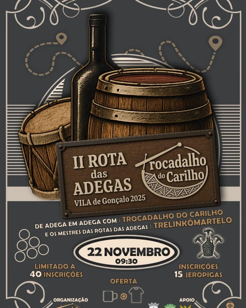 A iniciativa, limitada a 40 inscrições, tem início marcado para as 09h30 e propõe um percurso “de adega em adega”, que contará com a animação dos grupos Trocadalho do Carilho e TrelinkóMartelo, bem como dos “Mestres das Rotas das Adegas”.