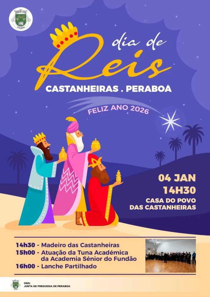 A Junta de Freguesia de Peraboa vai promover a celebração do Dia de Reis na localidade de Castanheiras, num evento agendado para o dia 4 de janeiro de 2026. A iniciativa terá lugar na Casa do Povo das Castanheiras e promete animar a tarde de domingo.