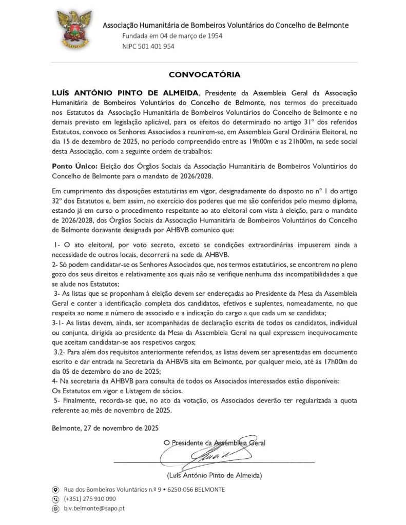 A Associação Humanitária de Bombeiros Voluntários do Concelho de Belmonte convocou os seus associados para uma Assembleia Geral Ordinária Eleitoral, agendada para o próximo mês de dezembro.