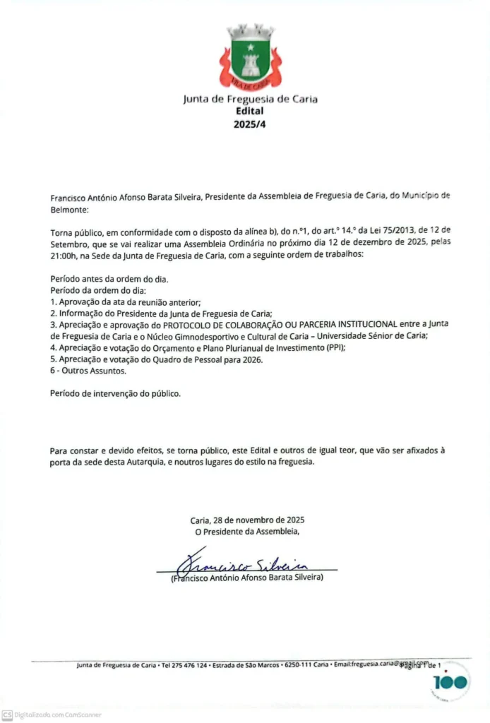 A Assembleia de Freguesia de Caria vai reunir em sessão ordinária no próximo dia 12 de dezembro, pelas 21h00. A sessão, que terá lugar na sede da Junta de Freguesia, conta com uma ordem de trabalhos que inclui a discussão e votação de documentos fundamentais para a gestão da autarquia.
