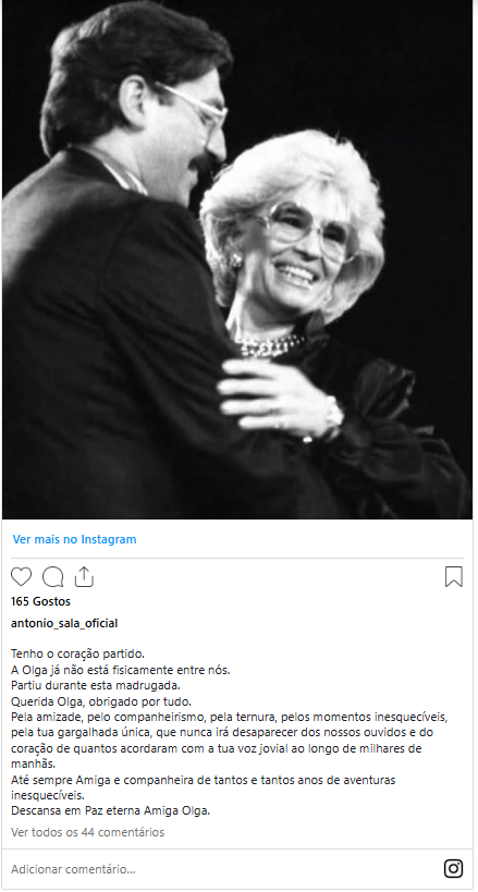 “Querida Olga, obrigado por tudo. Pela amizade, pelo companheirismo, pela ternura, pelos momentos inesquecíveis, pela tua gargalhada única, que nunca irá desaparecer dos nossos ouvidos e do coração de quantos acordaram com a tua voz jovial ao longo de milhares de manhãs.”