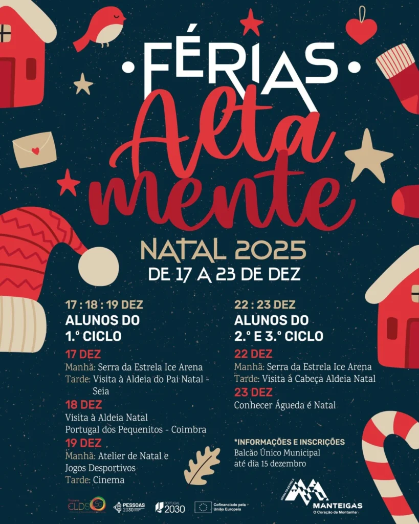 O Município de Manteigas volta a dinamizar o programa “Férias Altamente – Natal 2025”, que decorre de 17 a 23 de dezembro, com um conjunto de atividades natalícias, desportivas e culturais destinadas aos alunos do 1.º, 2.º e 3.º ciclos do ensino básico.