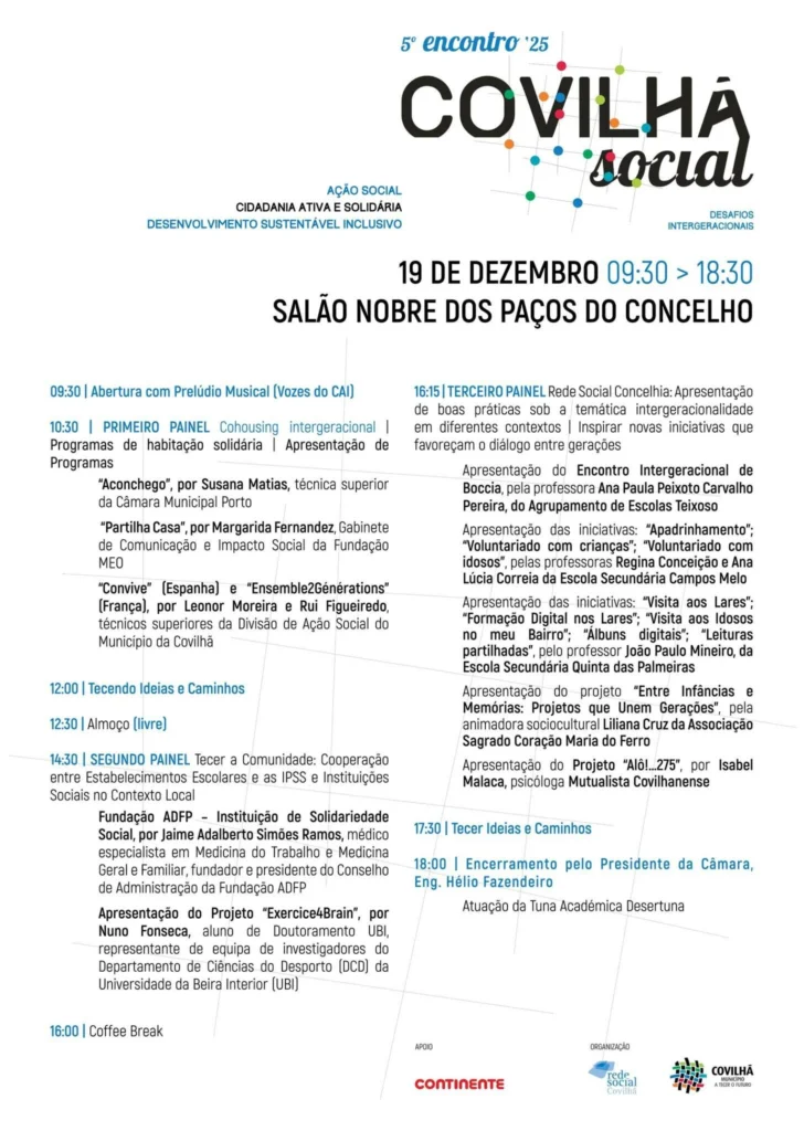 O Salão Nobre dos Paços do Concelho recebe, na sexta-feira, 19 de dezembro, entre as 09h30 e as 18h30, o 5.º Encontro “Covilhã Social”, uma iniciativa centrada na ação social, na cidadania ativa e solidária, no desenvolvimento sustentável inclusivo e nos desafios intergeracionais.