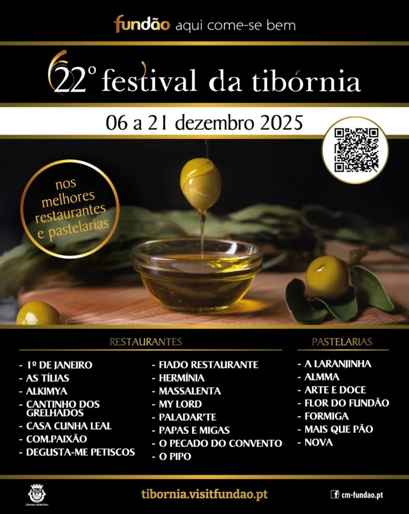 Está a decorrer, até domingo, 21 de dezembro de 2025, a 22.ª edição do Festival Gastronómico “Fundão, Aqui Come-se Bem” – Festival da Tibórnia, envolvendo 15 restaurantes e sete pastelarias do concelho do Fundão.