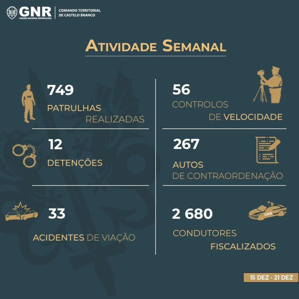 O Comando Territorial de Castelo Branco da GNR desenvolveu, entre 15 e 21 de dezembro, diversas ações de fiscalização, prevenção e patrulhamento, com o objetivo de reforçar a segurança e o bem-estar da população.
