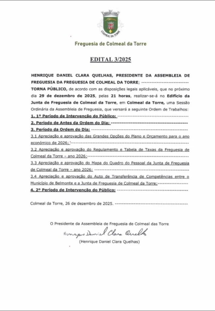 De acordo com o Edital n.º 3/2025, assinado pelo presidente da Assembleia de Freguesia, Henrique Daniel Clara Quelhas, a reunião incluiu dois períodos de intervenção do público e um período antes da ordem do dia.