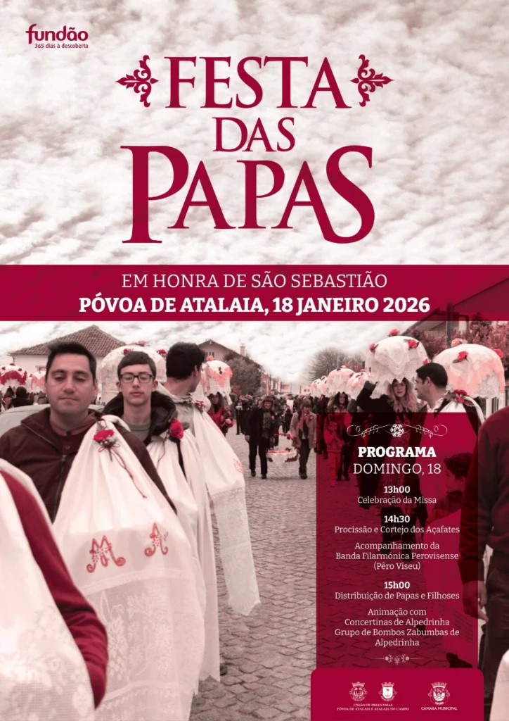 A Póvoa de Atalaia, no concelho do Fundão, recebe no domingo, 18 de janeiro, a festa em honra de São Sebastião, conhecida localmente como Festa das Papas. A iniciativa junta momentos religiosos e de tradição popular, com distribuição de papas e filhoses à comunidade.