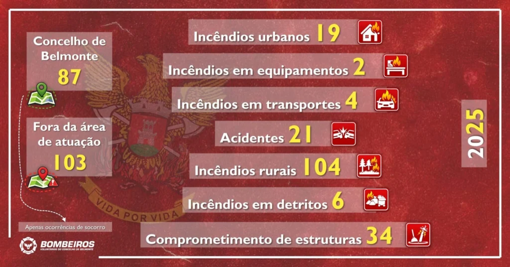 Os Bombeiros Voluntários do Concelho de Belmonte divulgaram o resumo da atividade operacional desenvolvida em 2025, num balanço que contabiliza 190 ocorrências de socorro. Deste total, 87 ocorreram no concelho de Belmonte e 103 foram registadas fora da área de atuação.