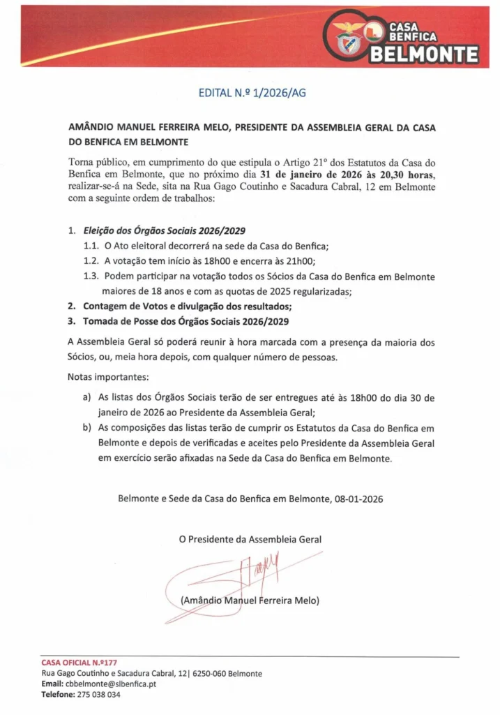 A Casa do Benfica em Belmonte convocou uma assembleia geral para sábado, 31 de janeiro, às 20h30, na sede situada na Rua Gago Coutinho e Sacadura Cabral, 12, em Belmonte.