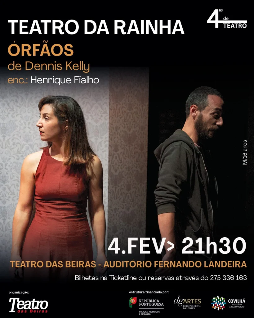 O Teatro da Rainha apresenta a peça Órfãos, de Dennis Kelly, na quarta feira, 4 de fevereiro, às 21h30, no Teatro das Beiras, Auditório Fernando Landeira. Os bilhetes estão disponíveis na bilheteira do Teatro das Beiras e na Ticketline, com reservas através do 275 336 163. Classificação etária M16.