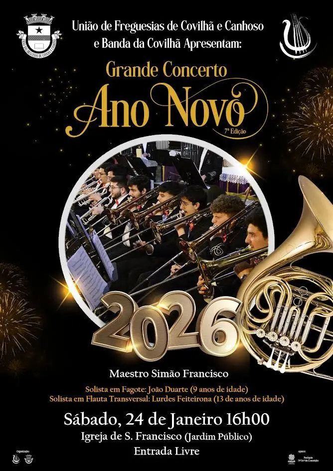 A Banda da Covilhã, em parceria com a União de Freguesias de Covilhã e Canhoso, promove no sábado, 24 de janeiro, às 16h00, a 7.ª edição do Grande Concerto de Ano Novo. O espetáculo tem entrada livre e realiza se na Igreja de S. Francisco, no Jardim Público da Covilhã.