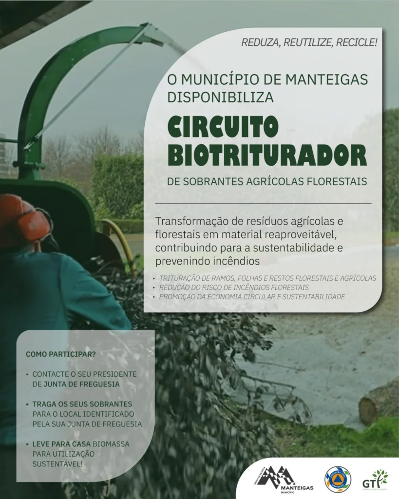 O Município de Manteigas vai implementar o Circuito do Biotriturador, uma iniciativa do Serviço Municipal de Proteção Civil, em articulação com o Gabinete Técnico Florestal, destinada a melhorar a gestão dos sobrantes florestais e agrícolas.