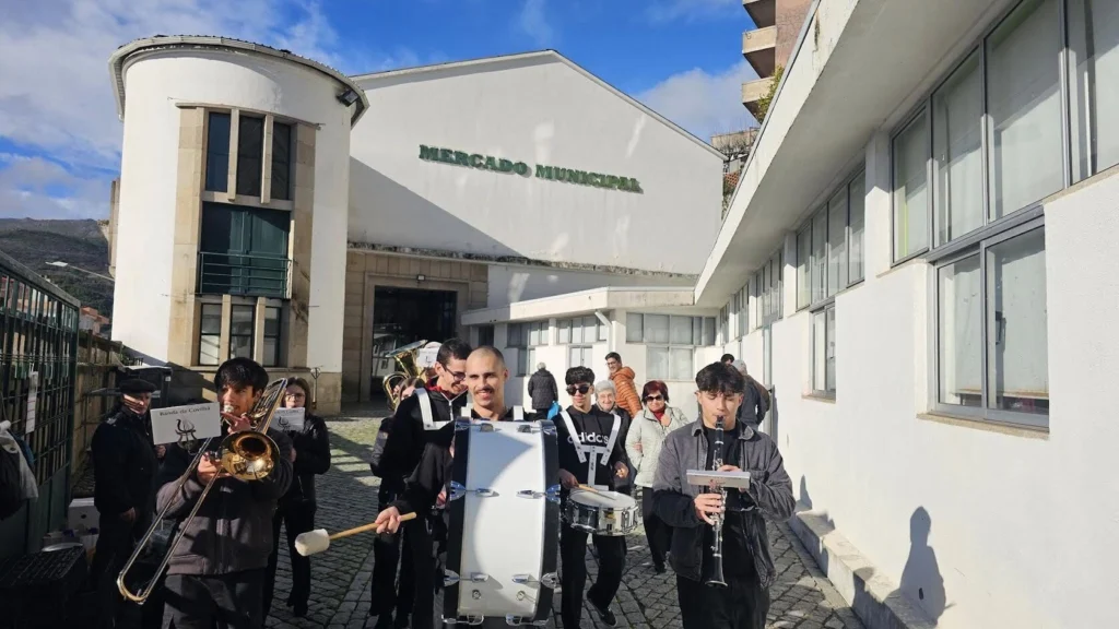 Um grupo de jovens músicos percorreu vários pontos da zona histórica, com paragens no Mercado Municipal, no Jardim Público e em diferentes espaços do comércio local, interpretando repertório tradicional associado a esta celebração popular e envolvendo moradores, comerciantes e visitantes.