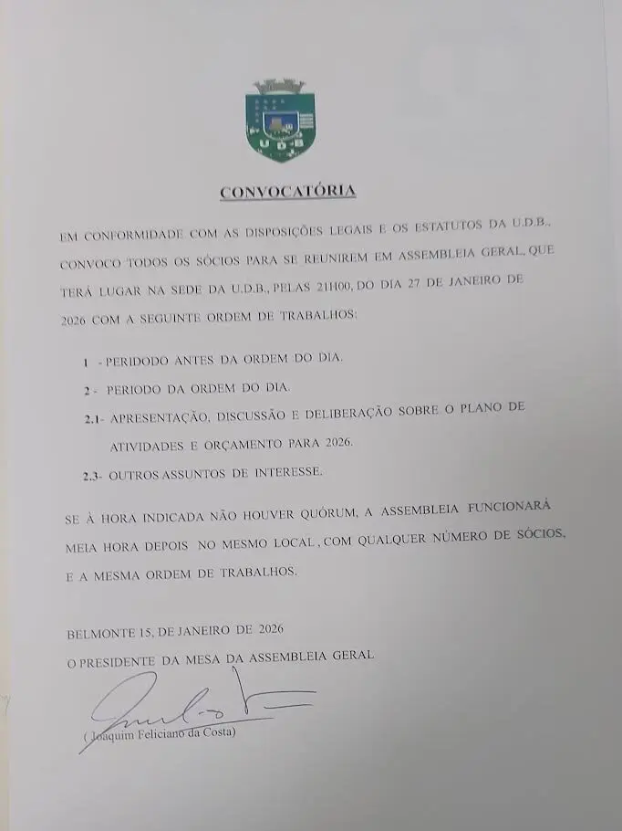 A União Desportiva de Belmonte convocou os sócios para uma assembleia geral marcada para terça-feira, 27 de janeiro, às 21h00, na sede do clube.