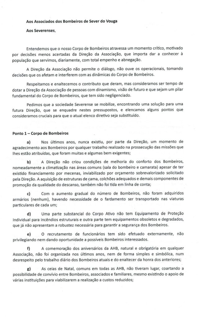 Perante este conjunto de críticas, os subscritores defendem que é tempo de dotar a Direção da Associação de pessoas com “dinamismo, visão de futuro e compromisso com o Corpo de Bombeiros”, apelando aos associados e à comunidade severense para que se mobilizem na construção de uma alternativa diretiva que responda às necessidades identificadas e reforce a sustentabilidade, a segurança e a eficácia do socorro prestado à população.