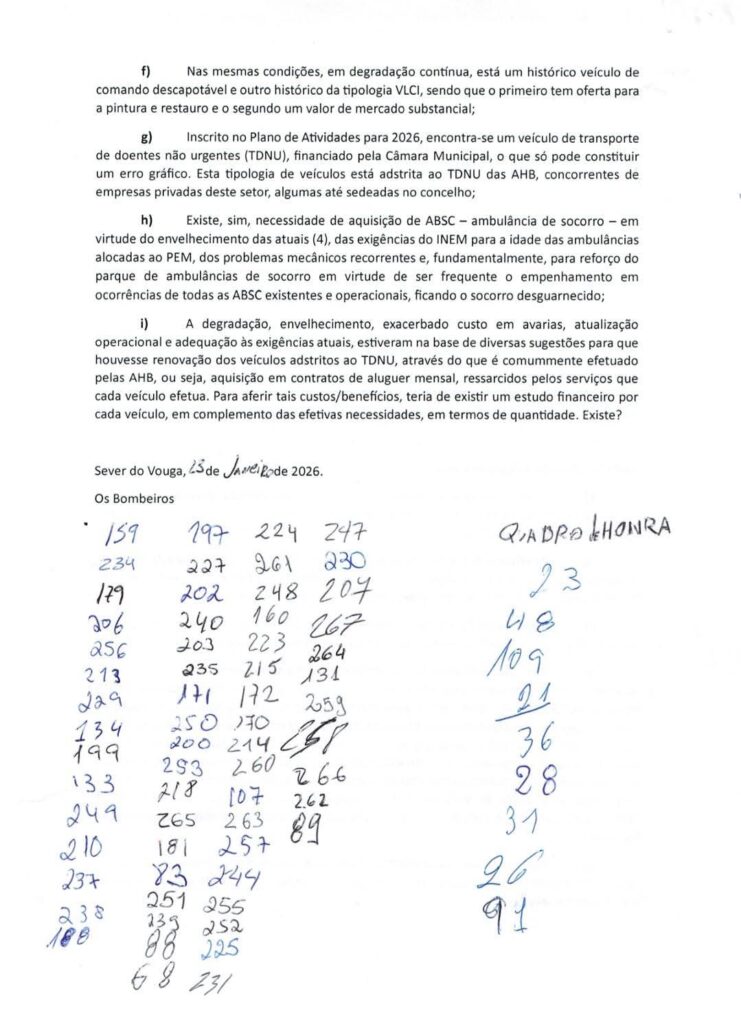 O documento questiona igualmente a inscrição, no Plano de Atividades para 2026, de um veículo de transporte de doentes não urgentes financiado pela Câmara Municipal, considerando tratar-se de um erro, uma vez que este tipo de serviço está reservado às associações humanitárias de bombeiros e a empresas privadas do setor. São ainda levantadas dúvidas sobre a inexistência de estudos custo-benefício relativamente à renovação da frota de TDNU, através de soluções de aluguer mensal, prática comum noutras associações.