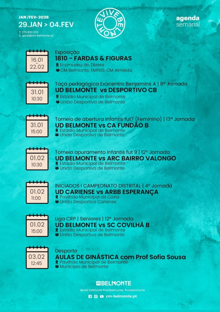 O Município de Belmonte divulgou a agenda semanal com iniciativas culturais e desportivas a decorrer no concelho, entre quinta-feira, 29 de janeiro, e quarta-feira, 4 de fevereiro.