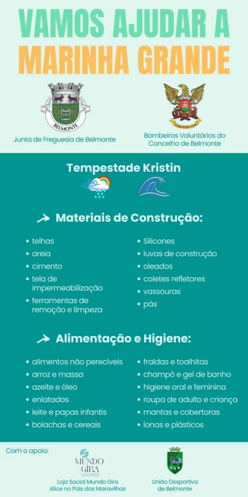 A Junta de Freguesia de Belmonte e os Bombeiros Voluntários do Concelho de Belmonte lançaram uma campanha de solidariedade para apoiar a população da Marinha Grande, na sequência dos danos provocados pela tempestade Kristin.