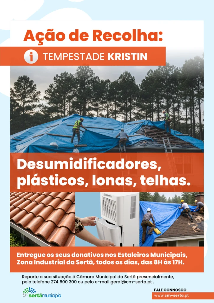 A Câmara Municipal da Sertã está a angariar materiais para apoiar as habitações afetadas pela tempestade Kristin em todo o concelho. São especialmente necessários desumidificadores, plásticos, lonas de proteção e telhas.
