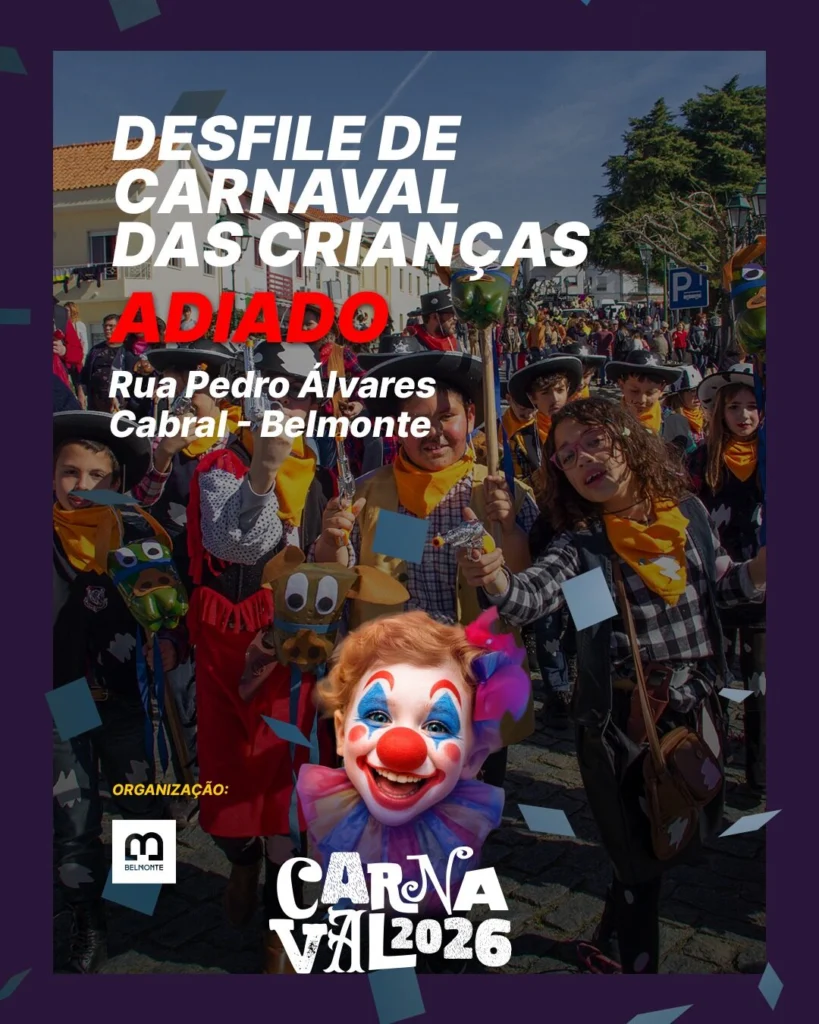 O Município de Belmonte informa que o desfile de Carnaval das crianças, inicialmente previsto para sexta feira, dia 13 de fevereiro, às 10h00, na Rua Pedro Álvares Cabral, será adiado para sexta feira, dia 27 de março, devido às condições climatéricas adversas, com previsão de aviso amarelo e precipitação intensa.