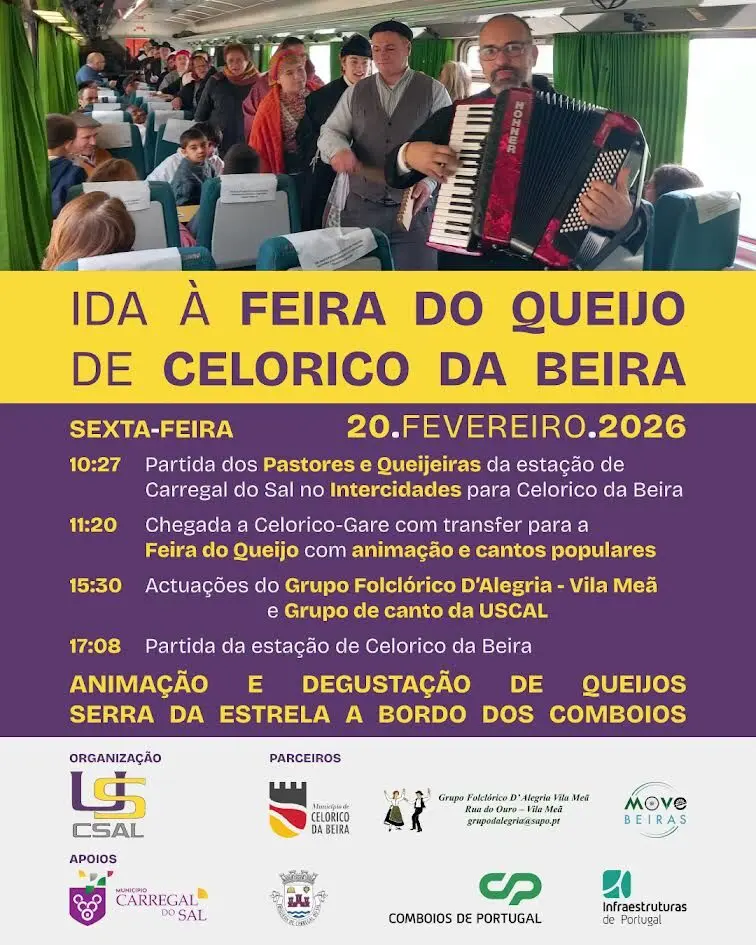 A ação é promovida pela Universidade Sénior de Carregal do Sal, em parceria com o Município de Celorico da Beira, a Associação Move Beiras e o Grupo Folclórico D’Alegria de Vila Meã. Os participantes vão apresentar se trajados de pastores e queijeiras e seguir viagem no Intercidades, com animação a bordo e degustação de queijos da Serra da Estrela, na ida e no regresso.