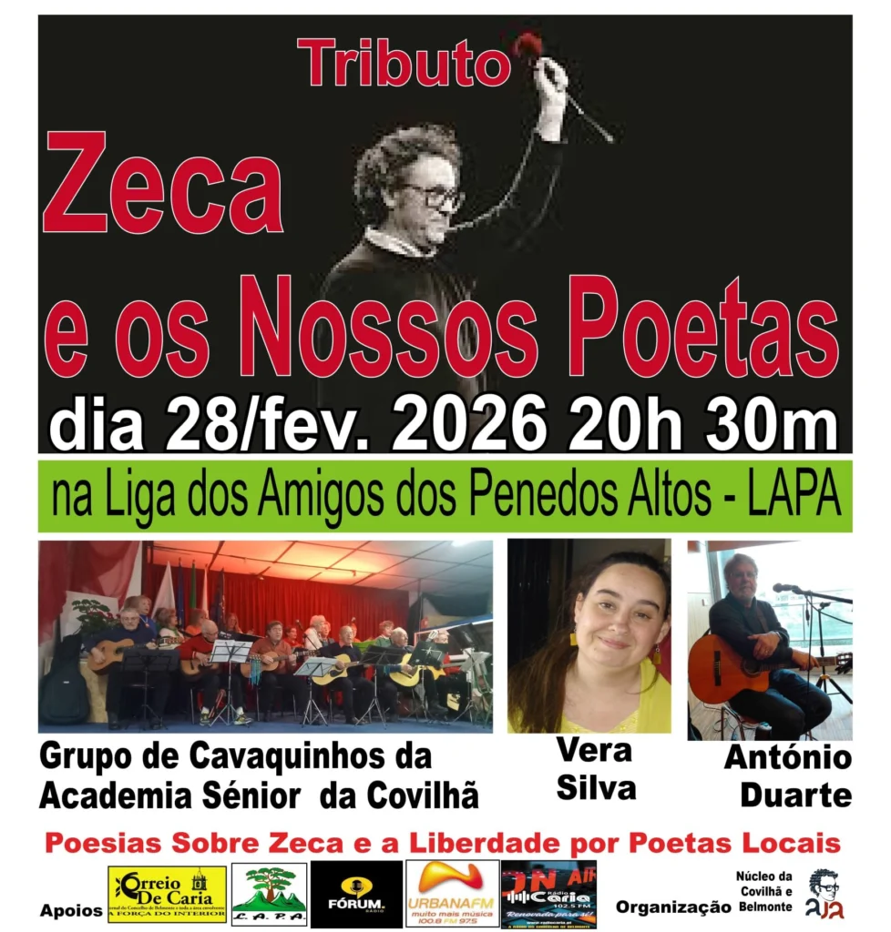 A Liga dos Amigos dos Penedos Altos, LAPA, na Covilhã, recebe no dia 28 de fevereiro, às 20h30, a iniciativa “Tributo Zeca e os nossos poetas”.