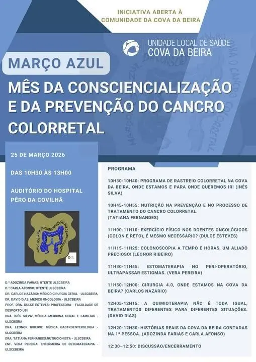 A Unidade Local de Saúde da Cova da Beira promove, no dia 25 de março, entre as 10h30 e as 13h00, uma iniciativa dedicada ao Mês da Consciencialização e da Prevenção do Cancro Colorretal. A sessão vai decorrer no Auditório do Hospital Pêro da Covilhã e é aberta a toda a comunidade.