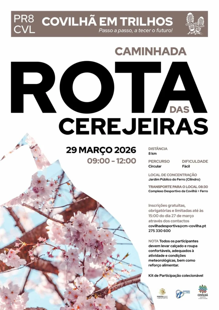 A Caminhada Rota das Cerejeiras vai realizar-se no dia 29 de março, entre as 09h00 e as 12h00, no âmbito da iniciativa Covilhã em Trilhos.