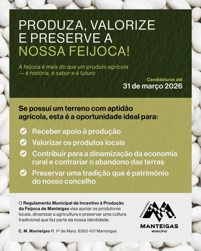 Inserido no Regulamento Municipal de Incentivo à Produção da Feijoca de Manteigas, o programa pretende também salvaguardar um produto tradicional ligado à história e à cultura local. Os interessados podem obter mais informações junto do Balcão Único do Município de Manteigas.