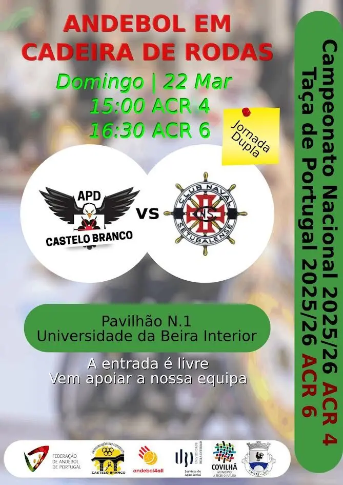 A Associação Portuguesa de Deficientes, Delegação Distrital de Castelo Branco, participa este domingo, 22 de março, em mais uma jornada do Campeonato Nacional de Andebol em Cadeira de Rodas e da Taça de Portugal, no Pavilhão n.º 1 da Universidade da Beira Interior, na Covilhã.