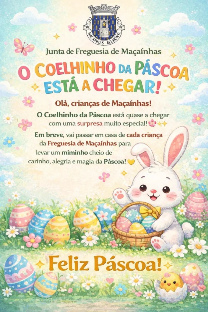 Segundo a mensagem divulgada pela autarquia, o chamado Coelhinho da Páscoa deverá passar em casa de cada criança de Maçainhas, numa ação pensada para tornar esta época ainda mais especial para as famílias. A Junta de Freguesia aproveitou também a ocasião para desejar a toda a população uma Páscoa feliz.