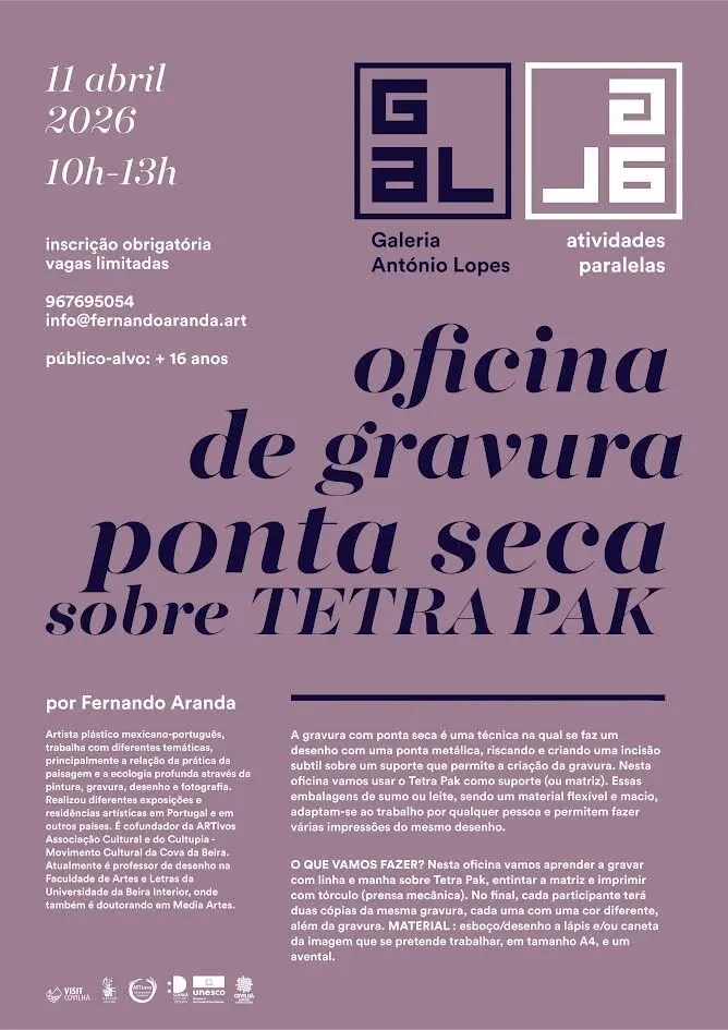 A Galeria António Lopes, na Covilhã, recebe mais uma oficina de fim de semana, desta vez dedicada à gravura em ponta seca sobre Tetra Pak. A iniciativa está marcada para sábado, 11 de abril, entre as 10h00 e as 13h00, e destina-se a participantes com mais de 16 anos.