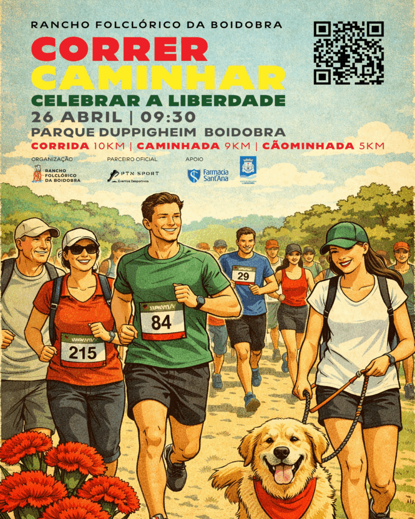 O Rancho Folclórico da Boidobra, em parceria com a PTN Eventos Desportivos, vai promover no domingo, 26 de abril, a iniciativa “Correr, Caminhar, Celebrar a Liberdade”, com partida marcada para as 09h30 no Parque Duppigheim, na Boidobra.