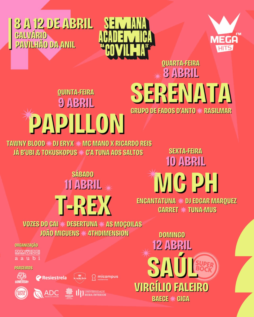 A Semana Académica da Covilhã decorre de 8 a 12 de abril, no Calvário e no Pavilhão da ANIL, com um cartaz que junta música e tradição académica ao longo de cinco noites. O evento é organizado pela Associação Académica da Universidade da Beira Interior.