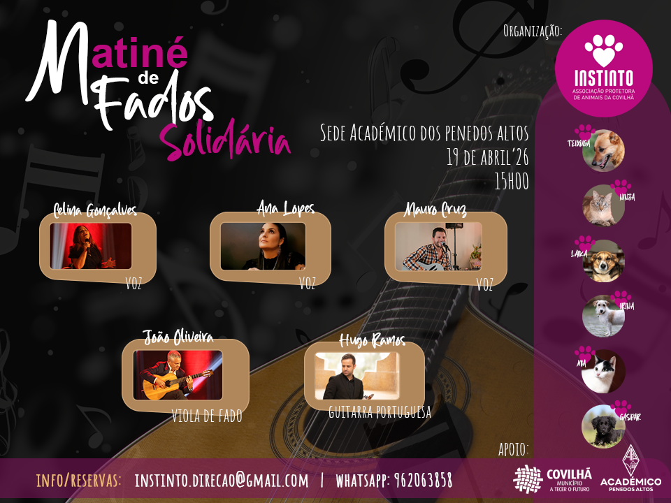 A Instinto, Associação Protetora de Animais da Covilhã, promove no domingo, 19 de abril, às 15h00, uma matiné de fados solidária no Académico dos Penedos Altos, com o objetivo de angariar fundos para suportar as despesas associadas ao resgate e tratamento de animais abandonados ou maltratados.