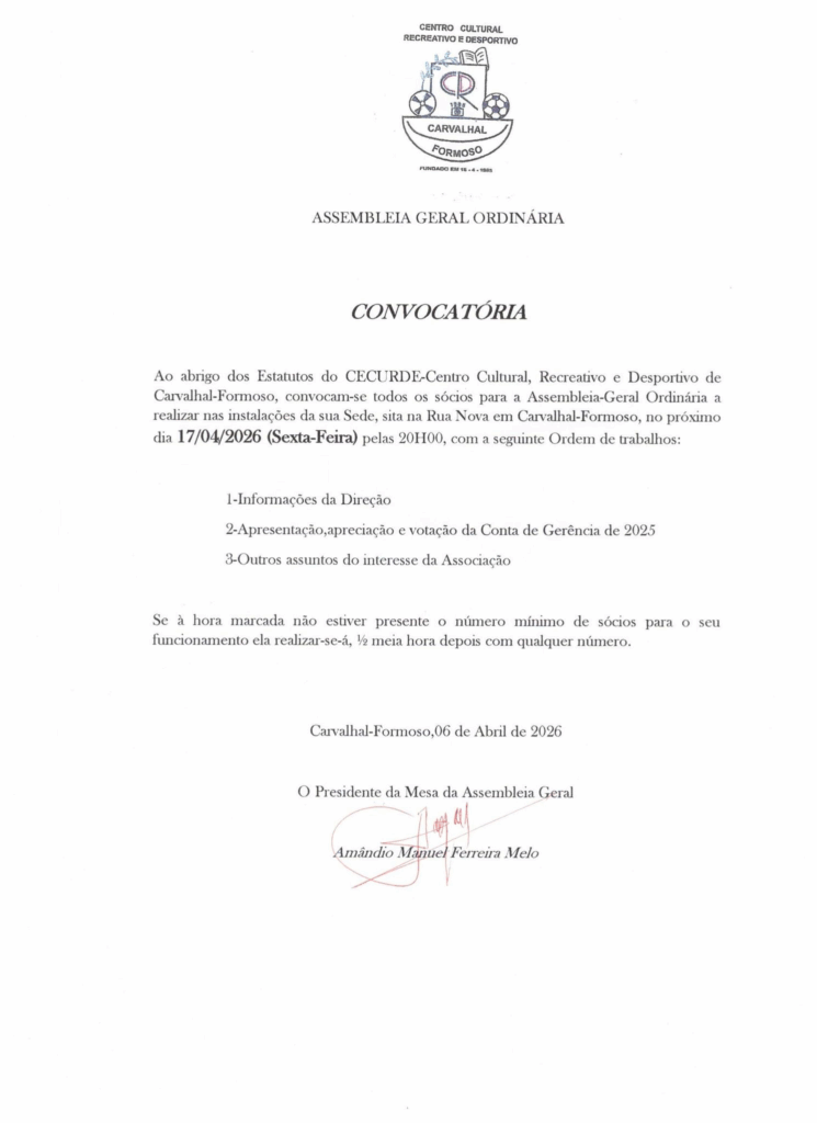 O Centro Cultural, Recreativo e Desportivo de Carvalhal Formoso realiza esta sexta-feira, 17 de abril, uma Assembleia Geral Ordinária, marcada para as 20h00, nas instalações da sua sede, na Rua Nova, em Carvalhal Formoso.