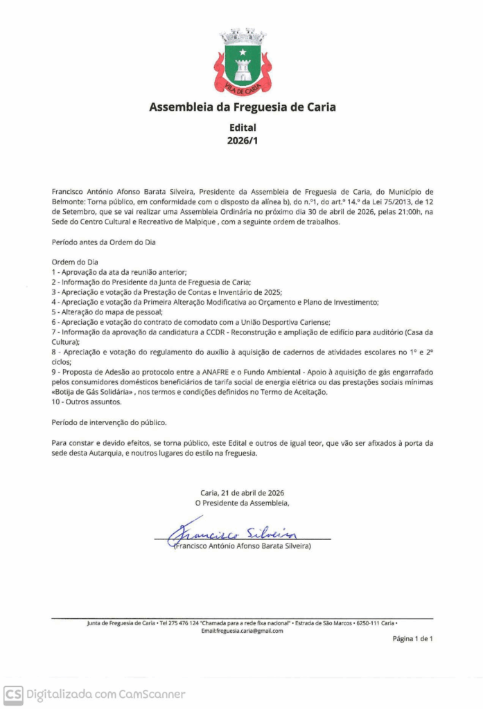 A Assembleia de Freguesia de Caria realiza uma sessão ordinária na quinta-feira, 30 de abril, pelas 21h00, na sede do Centro Cultural e Recreativo de Malpique.