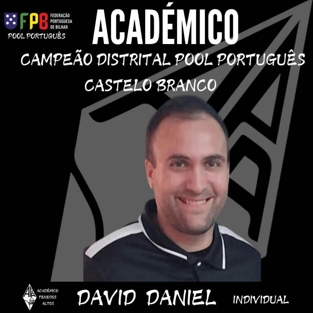 O atleta David Daniel, do Académico dos Penedos Altos, sagrou-se Campeão Distrital de Pool Português, na vertente individual, no distrito de Castelo Branco.