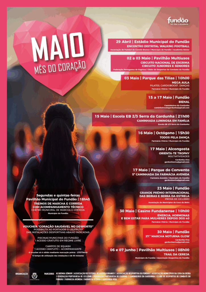 Durante a iniciativa, decorrem ainda treinos de marcha e corrida com acompanhamento técnico, às segundas e quintas-feiras, pelas 18h45, no Pavilhão Municipal do Fundão. O programa inclui também o voucher “Coração Saudável no Desporto”, que permite o acesso a instalações desportivas municipais, mediante as condições definidas pela organização.